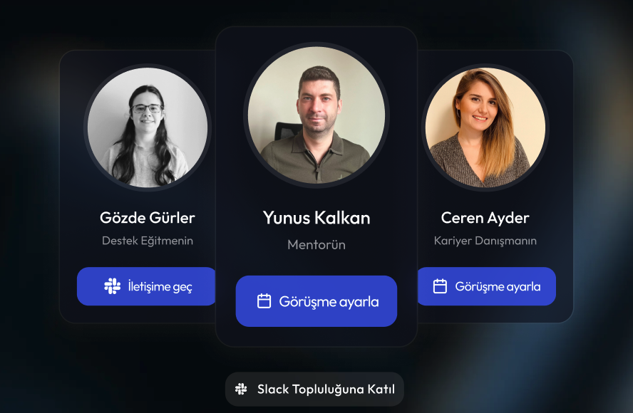 Eğitmen, mentor ve kariyer danışmanından oluşan kişisel destek ekibin seni yazılım yolculuğunda yalnız bırakmayacak. Ekibin takıldığında sorularını cevaplayacak ve kariyer yolculuğunda yönlendirecek.